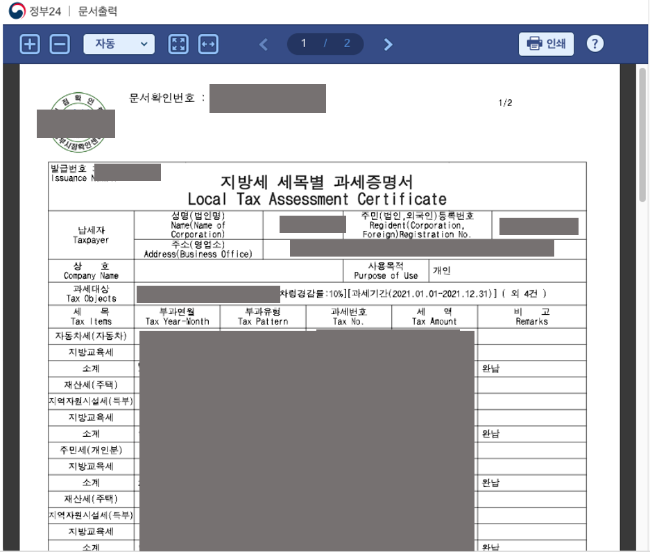 참고로, 지방세 세목별 과세 증명서란 지방에 거주하는 사람에게 부과된 세금 내역을 포함하는 문서이며, 세부적인 항목에 따라 납세한 사실증명을 위해 필요한 증명서를 의미합니다. 지방세는 종류에 따라 취득세, 등록세, 자동차세 등 여러 가지로 나뉘고, 해당 내용을 증명서로 발급 가능합니다.